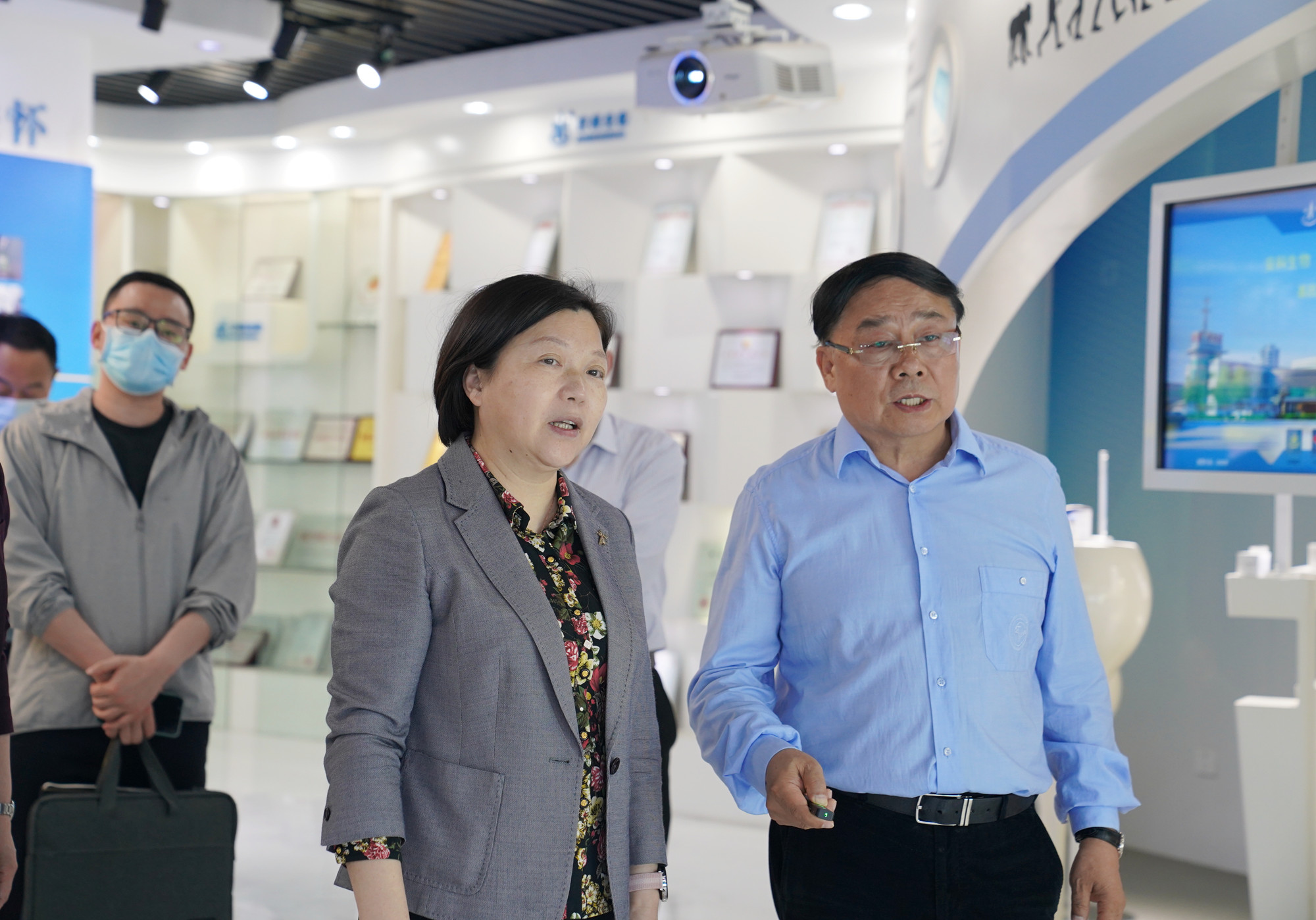 在公司展廳內,宋禮華董事長向陶儀聲主任一行介紹了公司的科技創(chuàng)新成果、前沿技術的開發(fā)、產業(yè)基地的規(guī)劃建設等方面的工作進展。