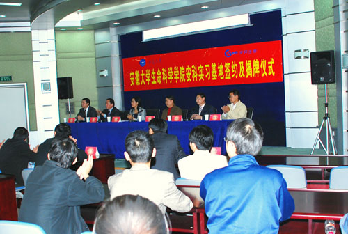 儀式由安大生命科學學院張部昌院長主持,宋禮華董事長代表安科講話,他愉快地表示,安徽大學與安科生物產學研合作的范圍寬廣、歷史悠久,富有成果,稱實習基地的建設將進一步拓寬雙方合作的渠道,一方面為安大在校生拓寬了社會實踐的范圍,為他們提供了鑒定理論知識、鍛煉現實技能的場所。使他們能將理論知識轉化為現實技能,再由現實技能升華為理論知識,通過這一螺旋上升的過程,實現知識的轉移和積累。這一充分利用校園優質教育資源以及企業的雄厚實踐設備條件,校企合作培養人才模式對于培養學生的創造能力、創新能力,培養生物技術行業的應用型人才有著實際而長遠的意義。另一方面,學生和企業可以以此為契機,加強彼此的了解,有利于推動將來畢業生到安科來工作,極大的解決安科的人才需求問題,最終達到雙方互補共贏的目標。