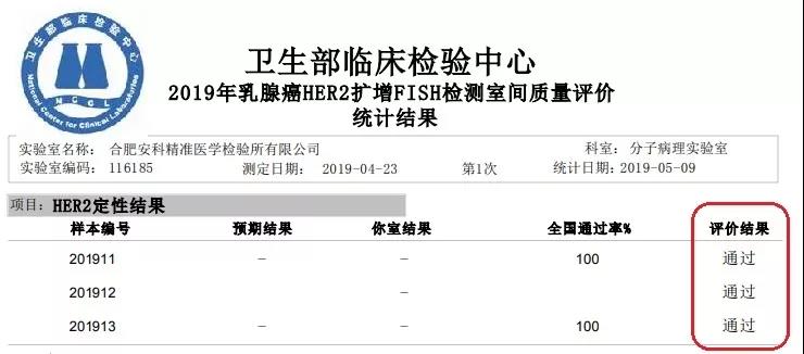 近日,國家衛生健康委臨床檢驗中心(NCCL)相繼發布了關于 2019 上半年人乳頭瘤病毒-16,-18及分型,EGFR 突變,乳腺癌 HER2 擴增 FISH 檢測,EML4-ALK 融合基因檢測(PCR)等室間質評結果。合肥安科醫學檢驗實驗室斬獲全滿分的成績。