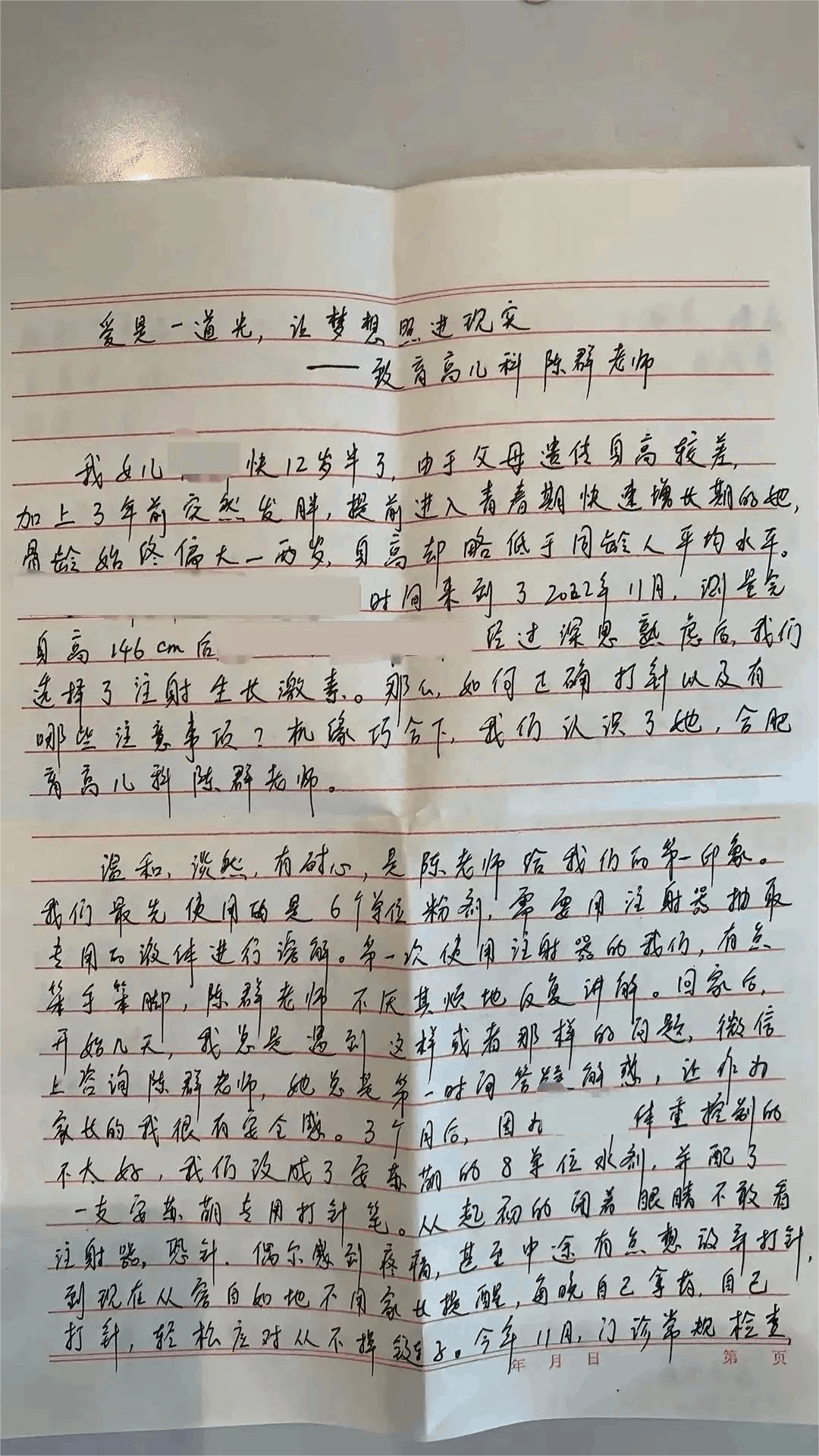 近日合肥育高門診身高管理師陳群收到了一封來自家長的充滿真摯情感的感謝信,信中字字句句無不流露出家長對陳群老師的高度認可和深切感激。