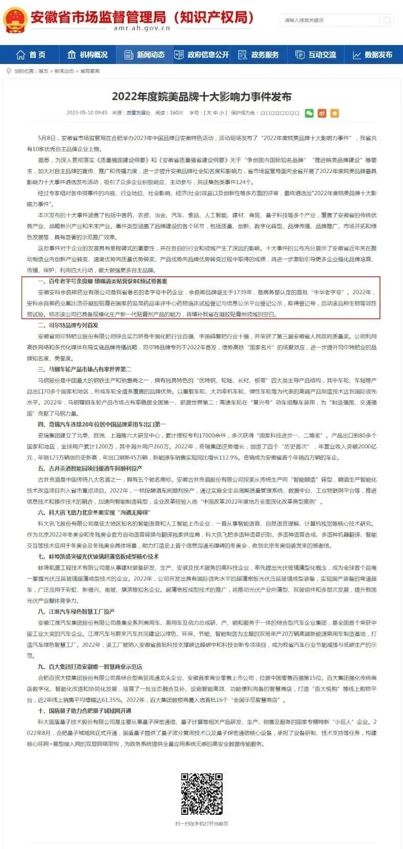 安科余良卿上榜“2022年度皖美品牌十大影響力事件”優秀企業名單