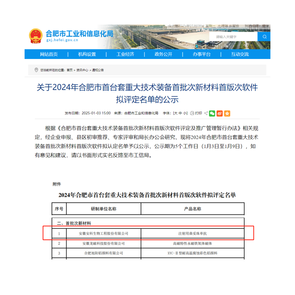 近日,合肥市工業和信息化局公布了《關于2024年合肥市首臺套重大技術裝備首批次新材料首版次軟件擬評定名單》,安徽安科生物工程(集團)股份有限公司自主研發并已獲批上市的安賽汀®(注射用曲妥珠單抗)入選為合肥市首批次新材料名單。